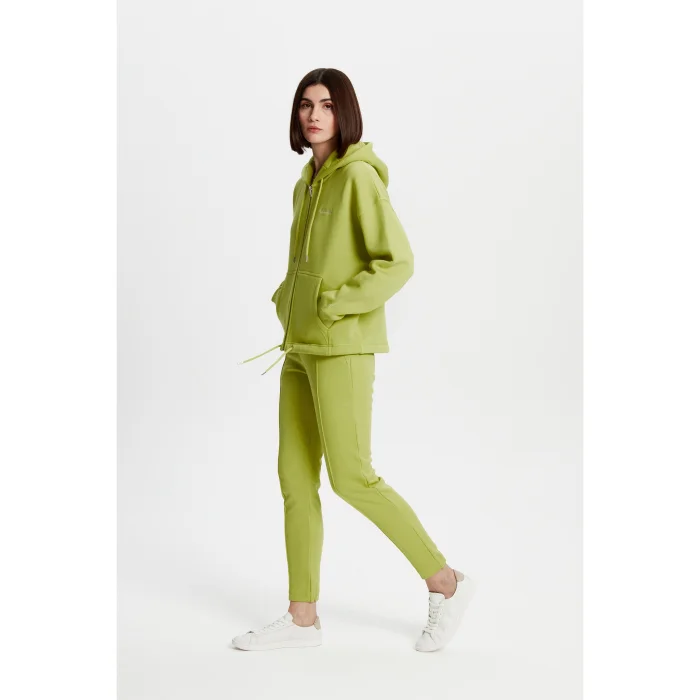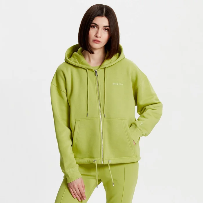 Loose-fitting zip-up sweatshirt with 80% Good cotton, 20% Recycled polyester hood and cord at the waist. The model is 1.74 meters tall and wears a size S. You can choose your own size.