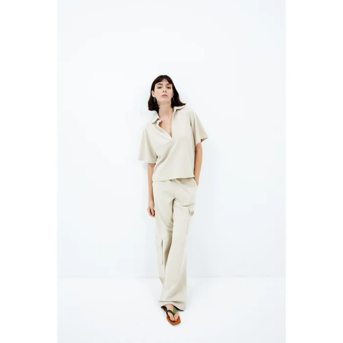 100% Good Cotton. Short-sleeved straight cut, padded t-shirt, deep collar cut. The model wears a size Small with a height of 1.79 meters. You can choose your own size. BSGWFBVP01