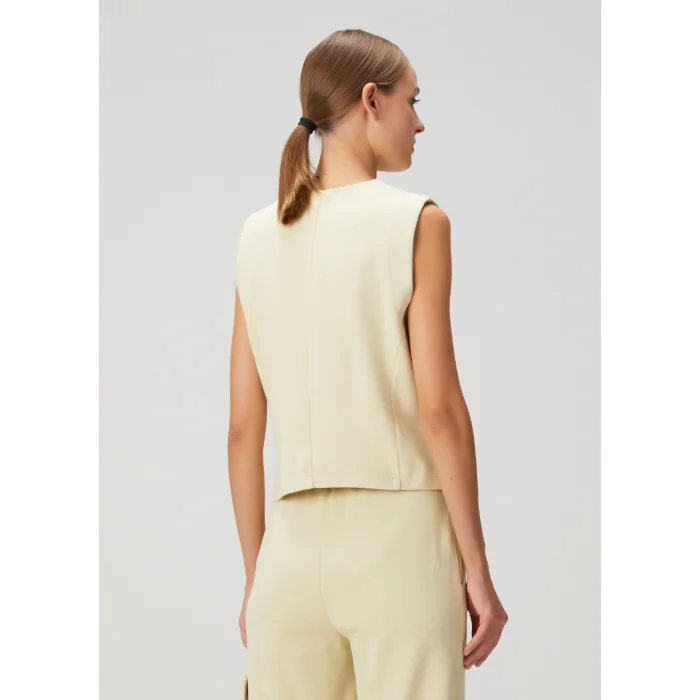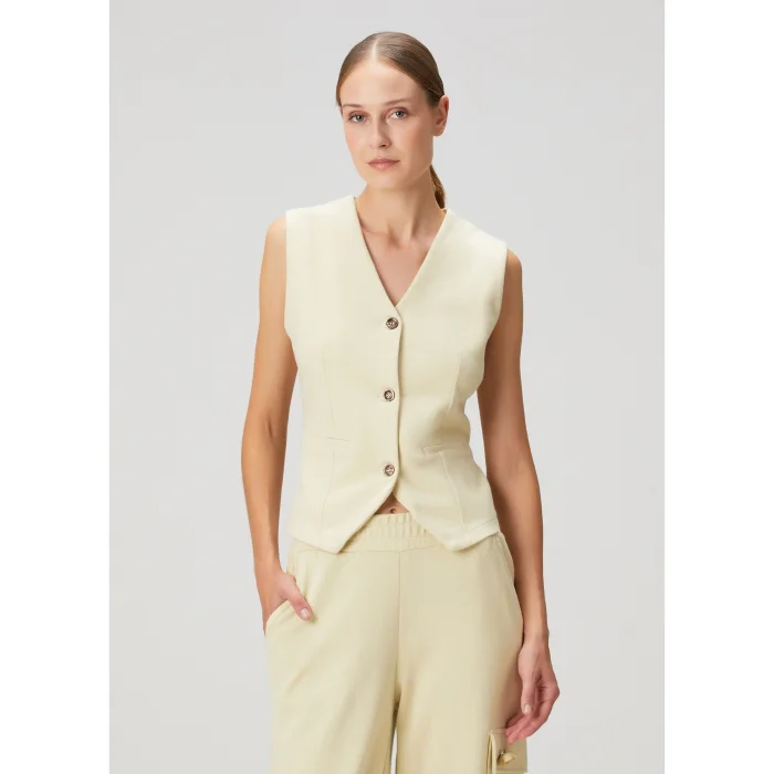 89% Good Cotton 9% Recycled Polyester 2 %Elestan sleeveless vest. V-neck with 3-button extendable pockets. The model wears a size Small with a height of 1.79 meters. You can choose your own size. BSGWFBJWC03