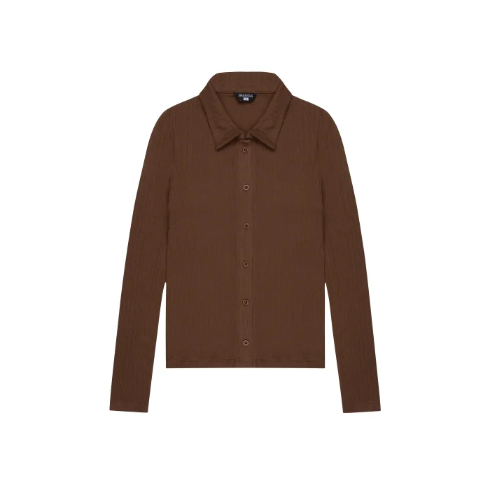 58% Recycled polyester, 28% Viscose, 14% Elastane slim fit front button-down knit shirt. The model is 1.74 meters tall and wears a size S. You can choose your own size.
