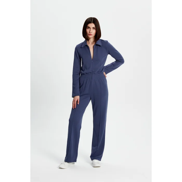 45% Good cotton, 55% Recycled polyester jersey jumpsuit with zipper and elasticated waistline. The model is 1.74 meters tall and wears a size S. You can choose your own size.