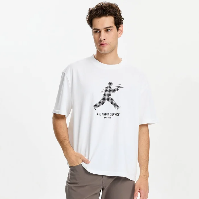 100% Good cotton loose-fitting short sleeve round neck t-shirt with ribbed neck. There is a large print design in the front center. The model is 1.87 meters tall and wears a size M. You can choose your own size. BSGMTMTS02
