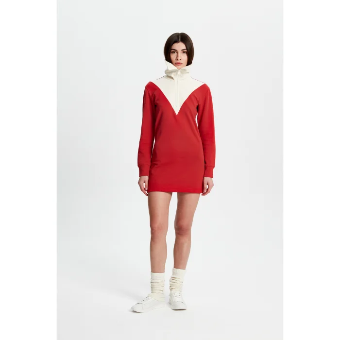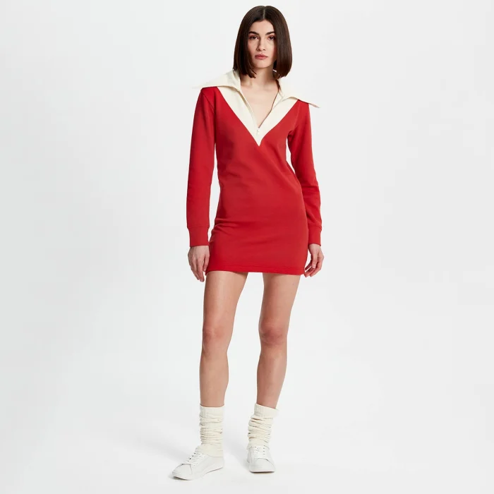 75% Good cotton, 25% Recycled polyester mini dress with wide neckline and zip at the front. His ankles are ribbed. The model is 1.74 meters tall and wears a size S. You can choose your own size.