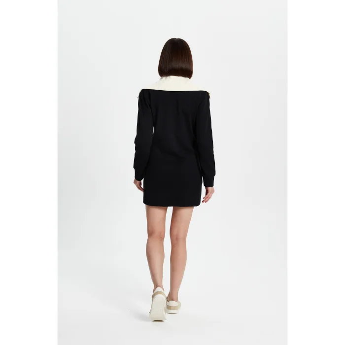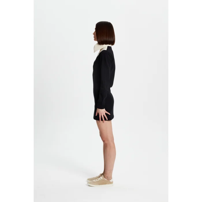 75% Good cotton, 25% Recycled polyester mini dress with wide neckline and zip at the front. His ankles are ribbed. The model is 1.74 meters tall and wears a size S. You can choose your own size.