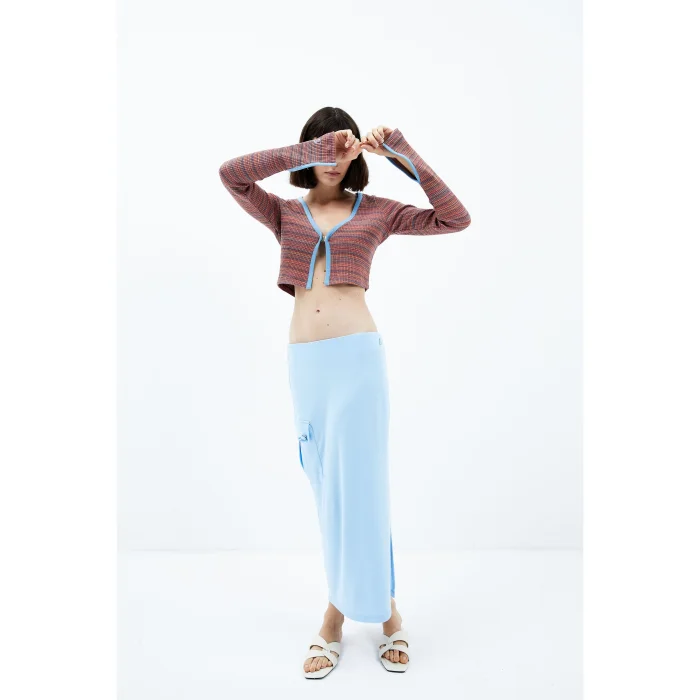 67% Tencel 33% Cotton Long low waist skirt with slits on the left side, pockets on the right side and detachable floral details. The model is 1.79 meters tall and wears a size Small. You can choose your own size. BSGWFBSK02