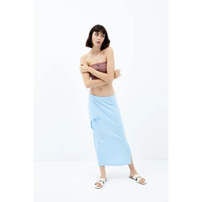 67% Tencel 33% Cotton Long low waist skirt with slits on the left side, pockets on the right side and detachable floral details. The model is 1.79 meters tall and wears a size Small. You can choose your own size. BSGWFBSK02