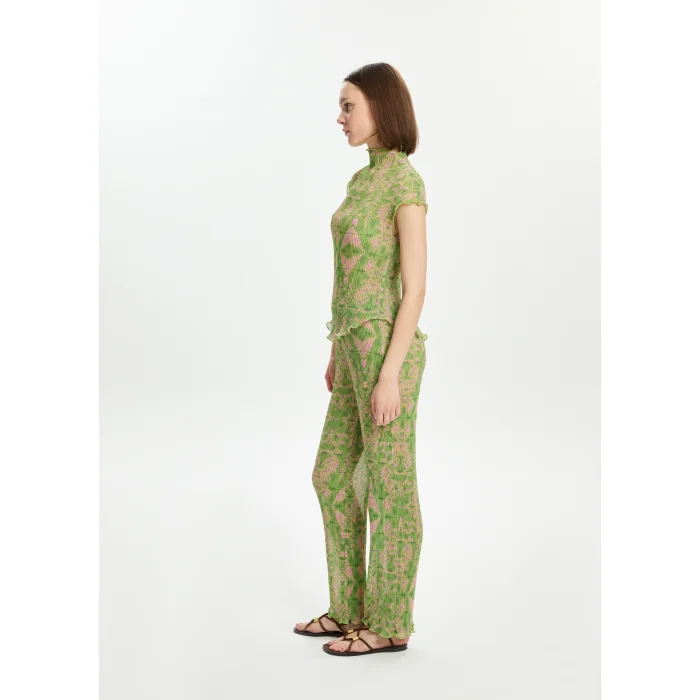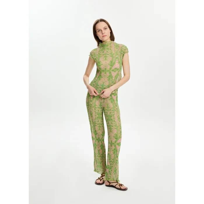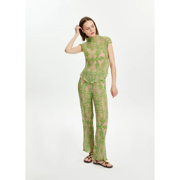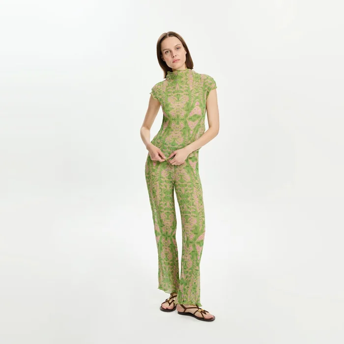 100% Polyester pleated chiffon waist elasticated trousers. There is a chiffon lining inside. The model is 1.77 meters tall and wears a size S. You can choose your own size. BSGWORPNT05-1