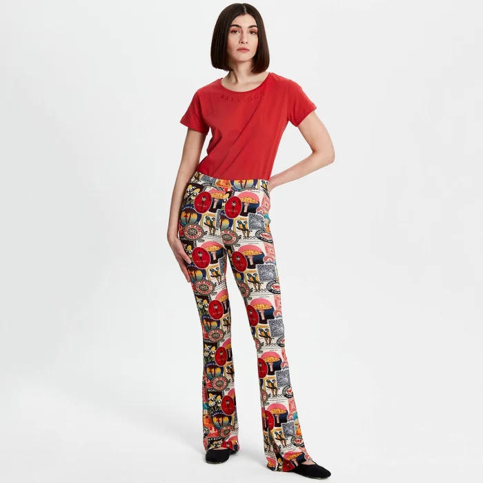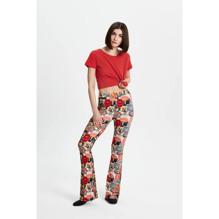 94% Viscose, 6% Elastane printed spanish leg trousers with elasticated waist. The model is 1.74 meters tall and wears a size S. You can choose your own size. BSGWTMPNT06