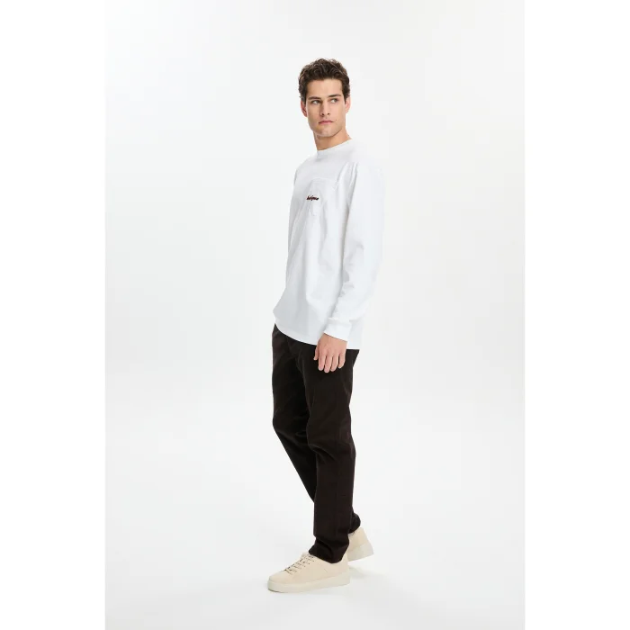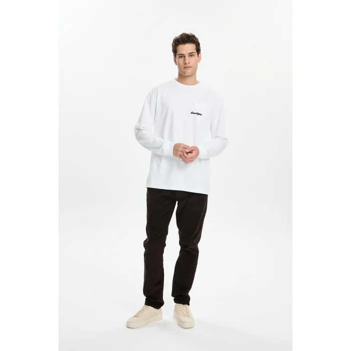 100% Good cotton loose-fitting long sleeve round neck t-shirt with neck and ankle ribbing. It has a triangular pocket with a flock logo printed on the chest. The model is 1.87 meters tall and wears a size M. You can choose your own size. BSGMTMLTS01-1