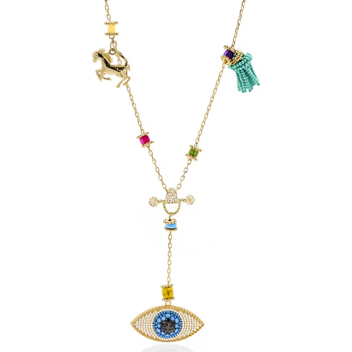 Production Type: Handmade Necklace Material: 22 carat gold-plated brass, Indian tassel, havlite stone, crystal stone Length: 82 cm Weight : 40 gr
