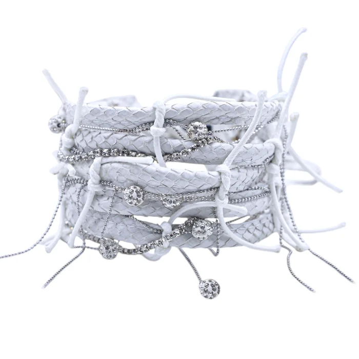 Genuine snake leather, brass chain, crystal stone, ball with marcacite