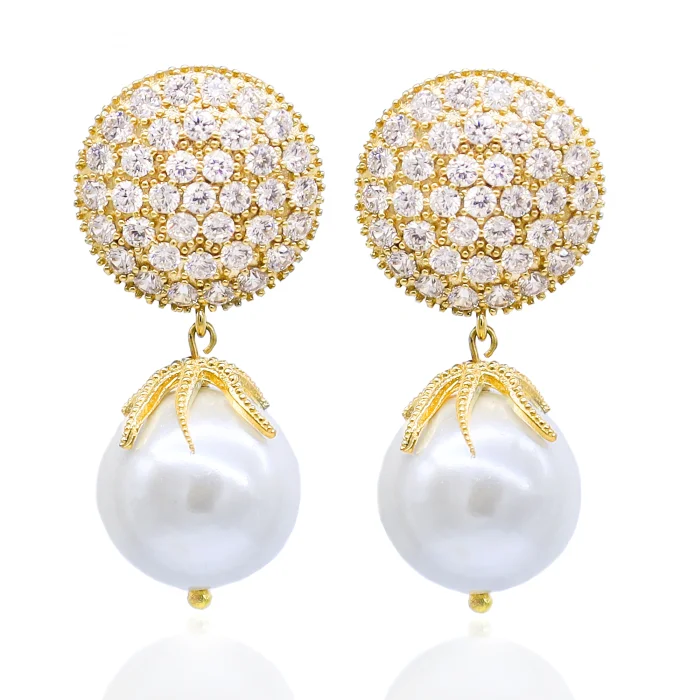 Production Type: Handmade Material: 22 carat gold-plated brass, diamond mount earring crown, 15 mm majorca pearl Weight : 9 gr