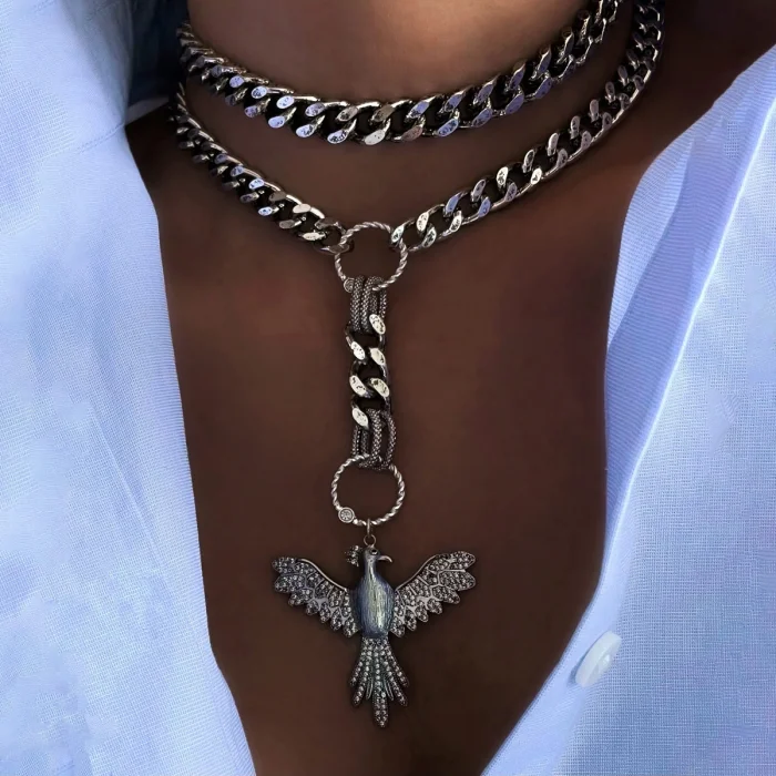 Description : Includes two necklaces Production Type: Handmade Material: 925 sterling silver plated steel chain, 22 sterling gold plated brass chain Length: Leash chain 35 cm + 5 cm extension chain, Phoenix necklace 40 cm + 5 cm extension chain, Phoenix pendant length 10 cm Weight : 141 gr