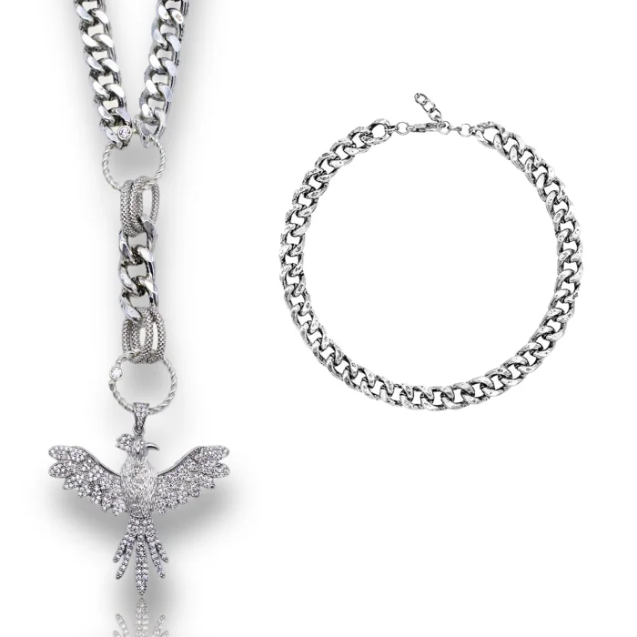 Description : Includes two necklaces Production Type: Handmade Material: 925 sterling silver plated steel chain, 22 sterling gold plated brass chain Length: Leash chain 35 cm + 5 cm extension chain, Phoenix necklace 40 cm + 5 cm extension chain, Phoenix pendant length 10 cm Weight : 141 gr