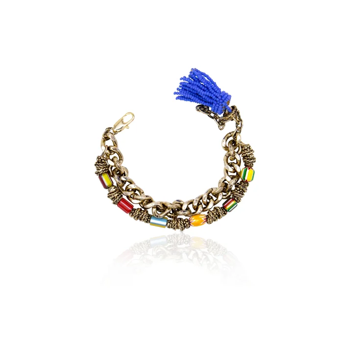 Production Type: Handmade Bracelet Material: 22 carat gold-plated brass, natural stone, Indian tassel Length: 17 cm + 5 cm extension chain Weight : 66 gr