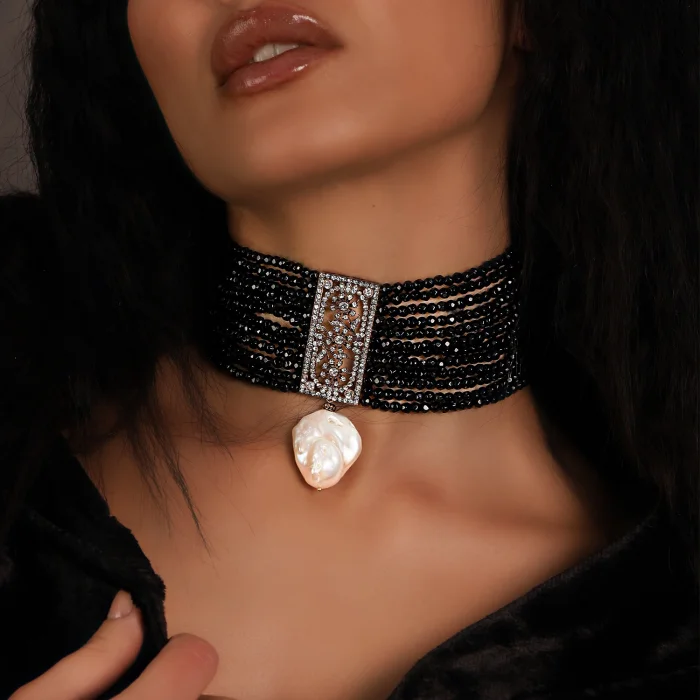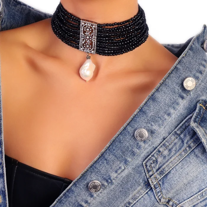 Production Type: Handmade Material: Faceted onyx stone, baroque pearl Length: 35 cm + 5 cm extension