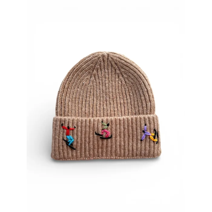 Beige wool beanie with skier embroidery