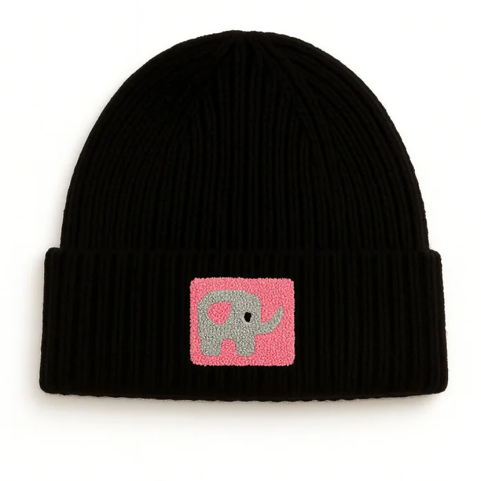 Product: Black Beanie Pink Elephant Punch-embroidery Patterned Luxury Wool Hat