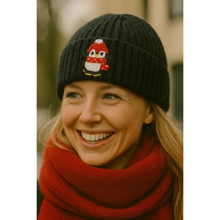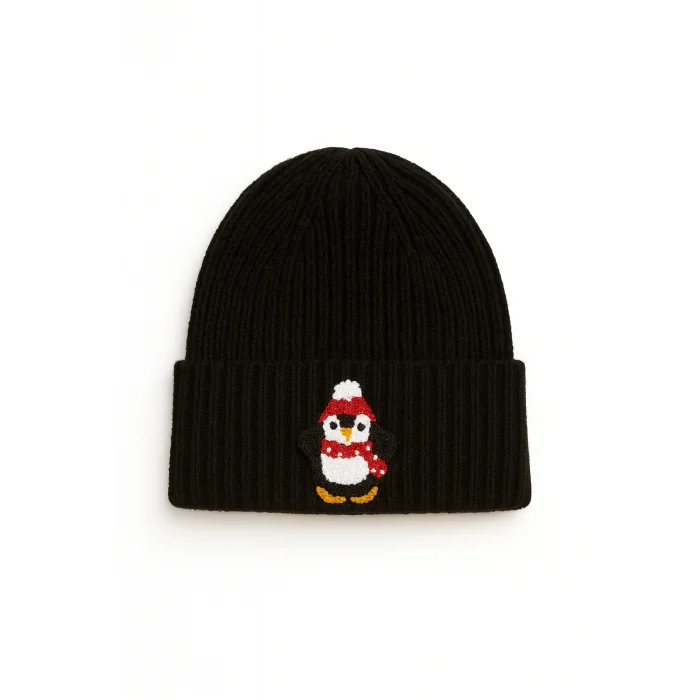 Product: Black Beanie With Scarf Penguin Punch-embroidery Patterned Luxury Wool Hat Holiday/christmas Gift