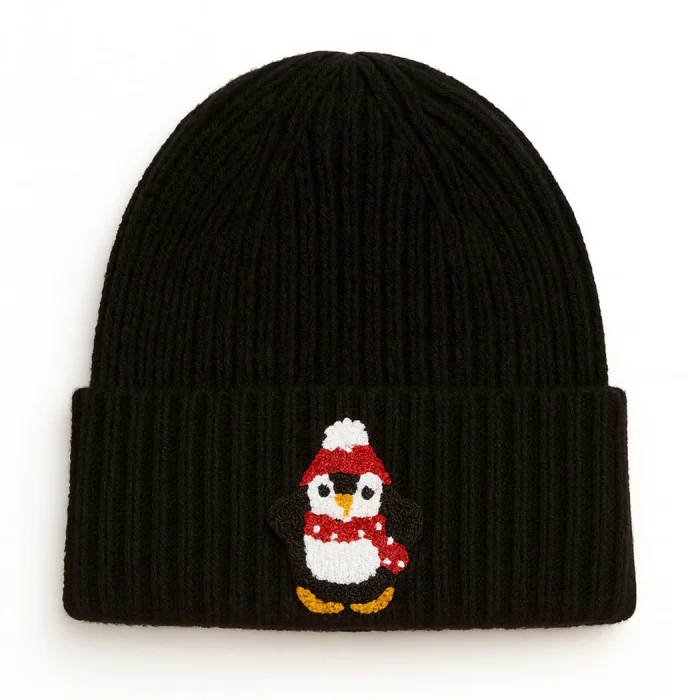 Black Beanie With Scarf Penguin Punch-embroidery Patterned Luxury Wool Hat Holiday/christmas Gift