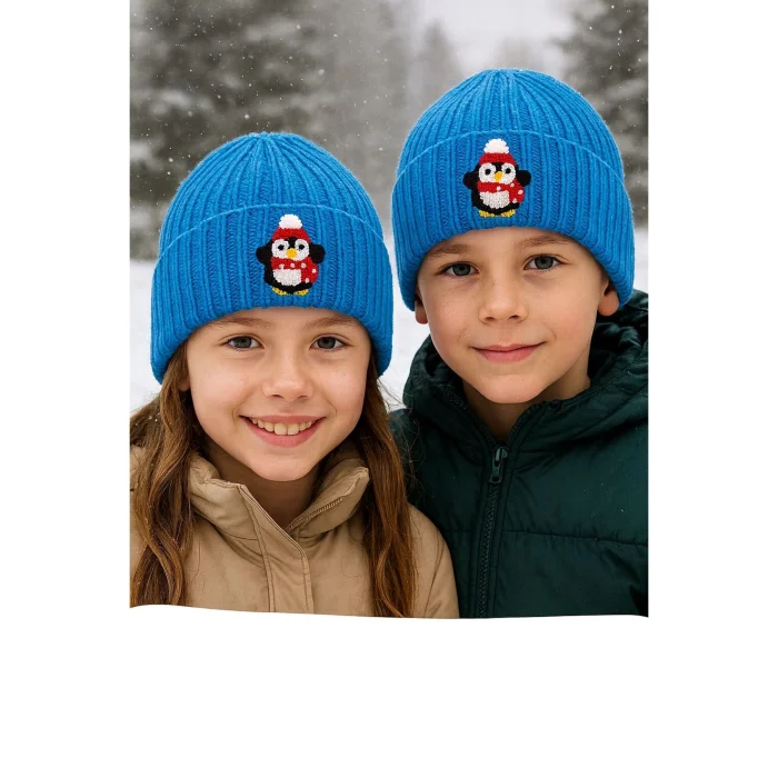 Decorated with cute penguin figures and offered to children, this beanie offers elegance and warmth together in winter; Thanks to its wool material, it keeps children's heads warm in cold weather, while at the same time providing comfort with its soft texture; Its woven fabric structure increases durability, offering long-term use and resistance to frequent washing;; This beanie, specially designed for children, stands out as both a fun and functional accessory with its Christmas-themed design;