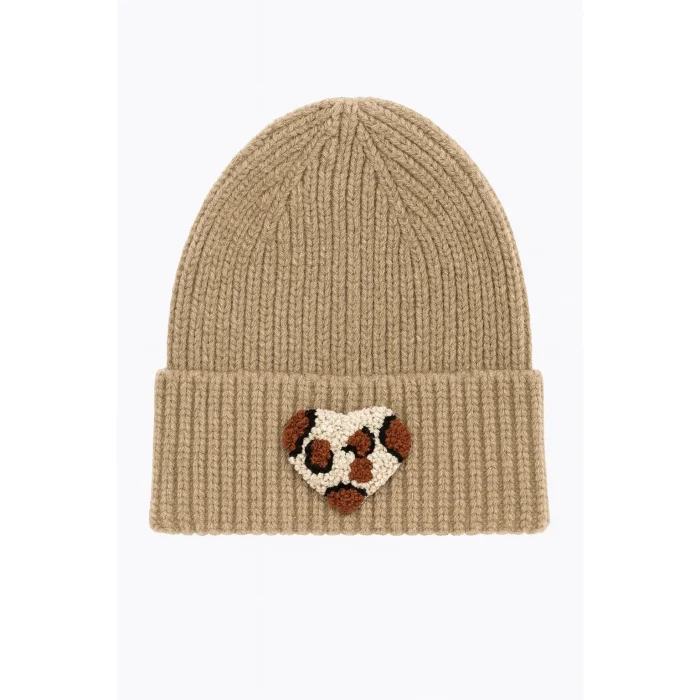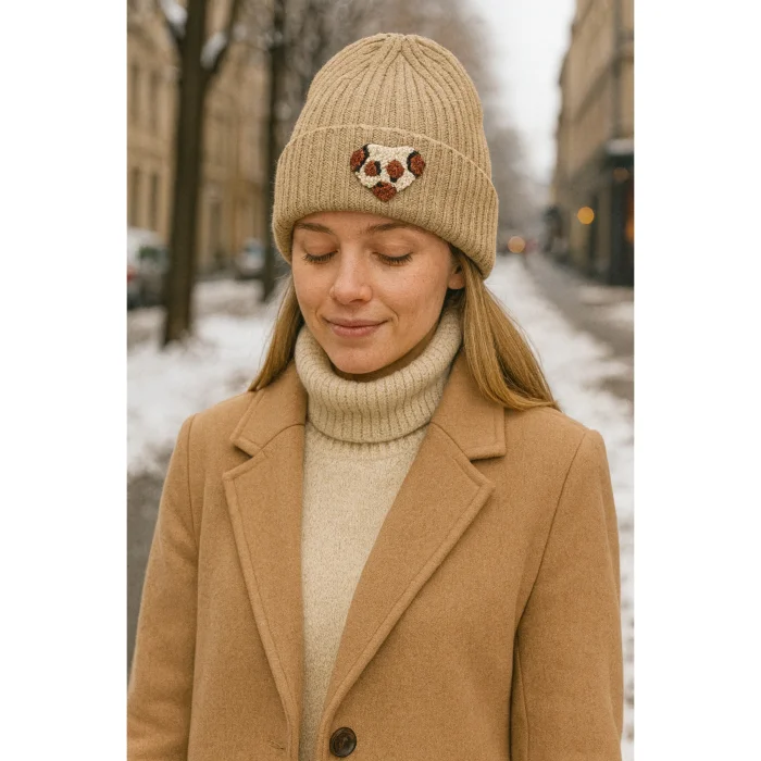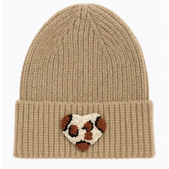 Product: Brown Dark Cream Beanie Leopard Heart Punch-embroidery Detailed Gift Holiday/christmas