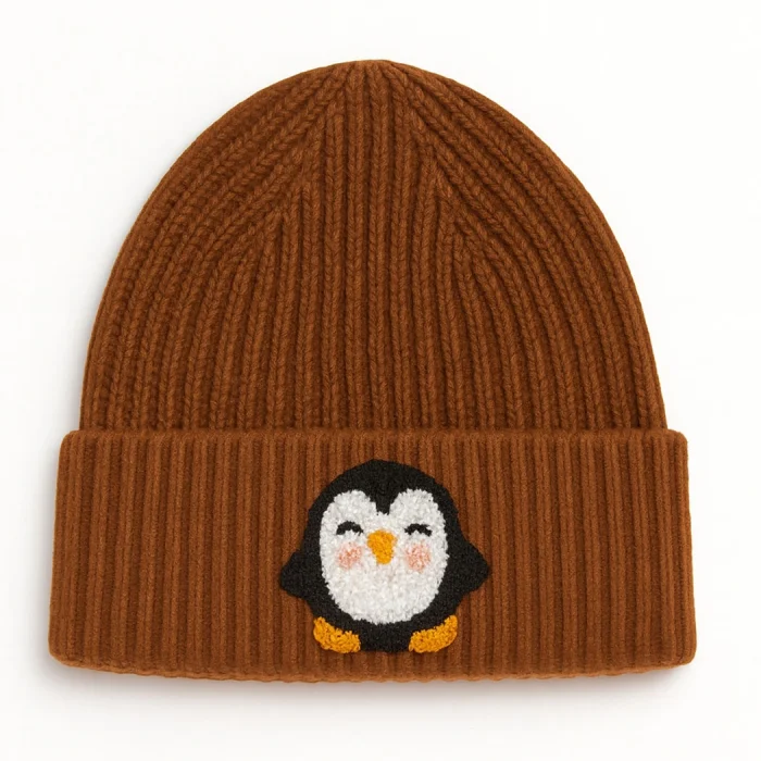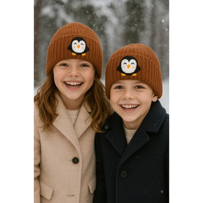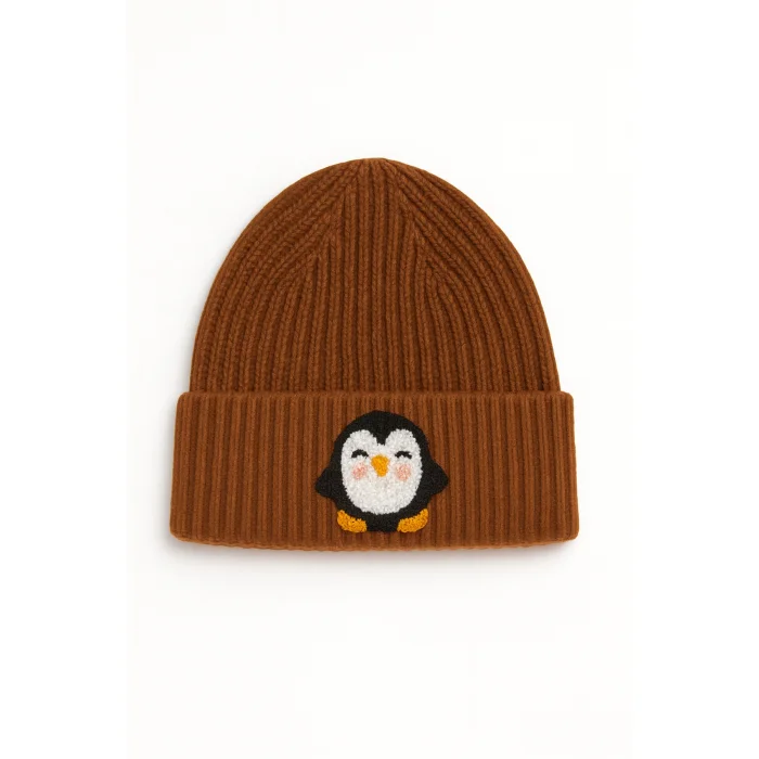 Product: Brown Kids Beanie Sarı Ayak Penguin Punch-embroidery Patterned Luxury Wool Hat Holiday/christmas Gift