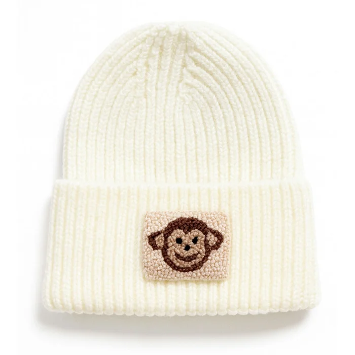 Product: Cream Wool Kids Beaniesi Monkey Motif Punch-embroidery Detailed