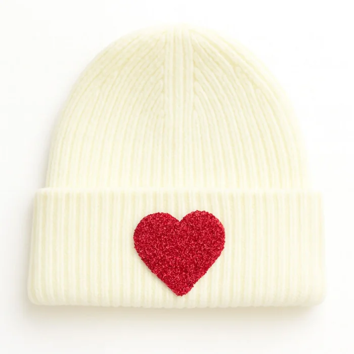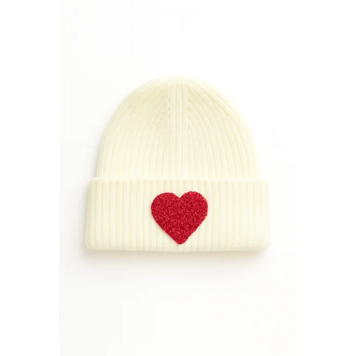 Product: Cream Wool Kids Beaniesi Red Glitter Heart Motif Punch-embroidery Detailed