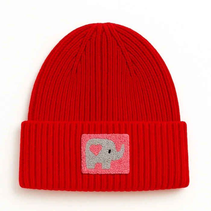 Product: Red Beanie Pink Elephant Punch-embroidery Patterned Luxury Wool Hat Holiday/christmas Gift