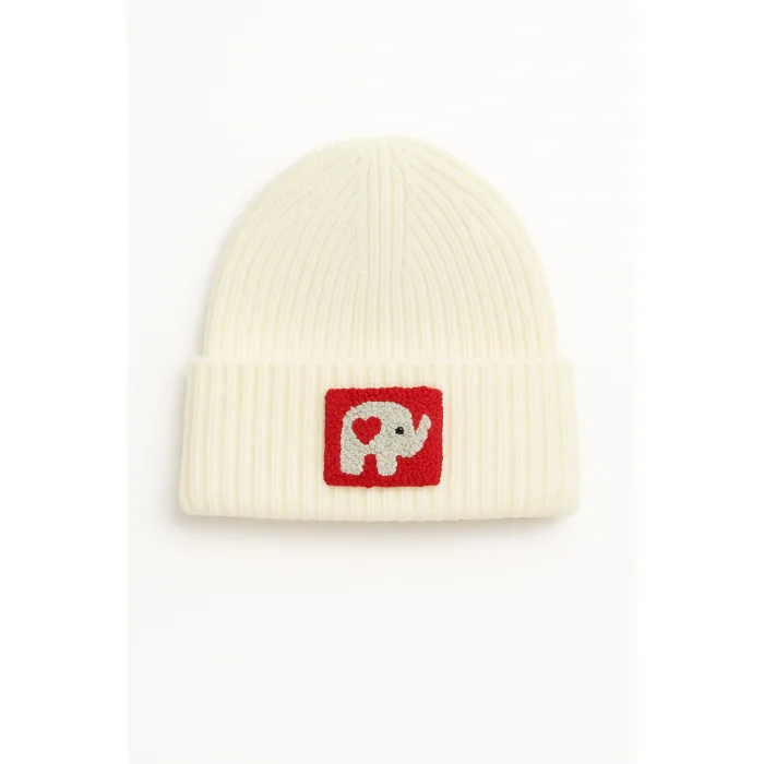 White Cream Wool Luxury Beanie Red Elephant Punch-embroidery Detailed , Unisex ( Punch-embroidery Detay Sağ Yandadır )