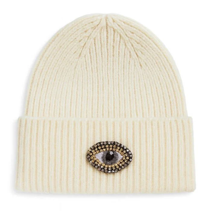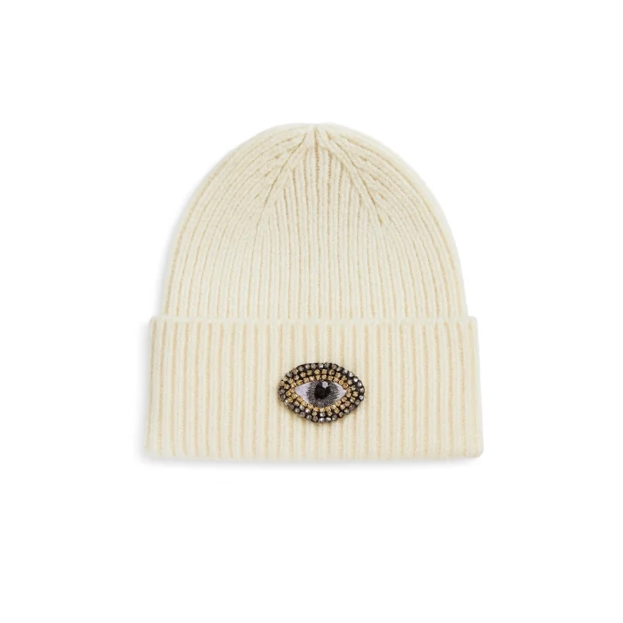 Product: White Cream Woollü Eye Beanie Crystal Bead Detailed Hat Holiday/christmas Gift