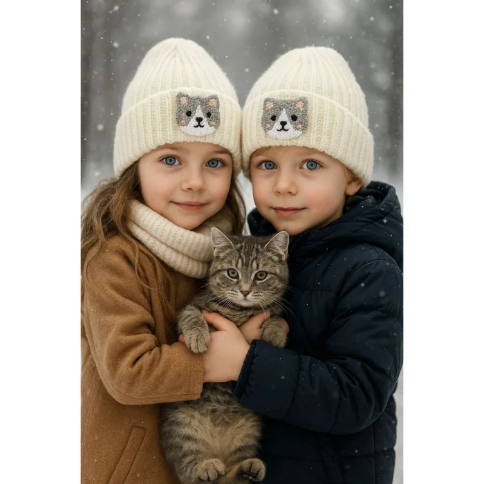 White wool children's-teen beanie with cat punch figure Thanks to its wool material, it keeps children's heads warm and offers a natural softness;; Woven fabric structure increases durability and provides long-term use; It is specially designed for children and their convenience and comfort are prioritized; It has a stylish design that is presented to children with cute animal figures and color combination; If you want to send it as a gift, it is sent in a very elegant package.
