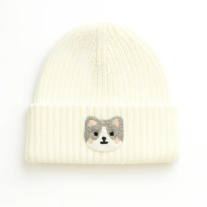 Product: White Wool Kids-youth Beaniesi Cat Punch-embroidery Motif Giftlik