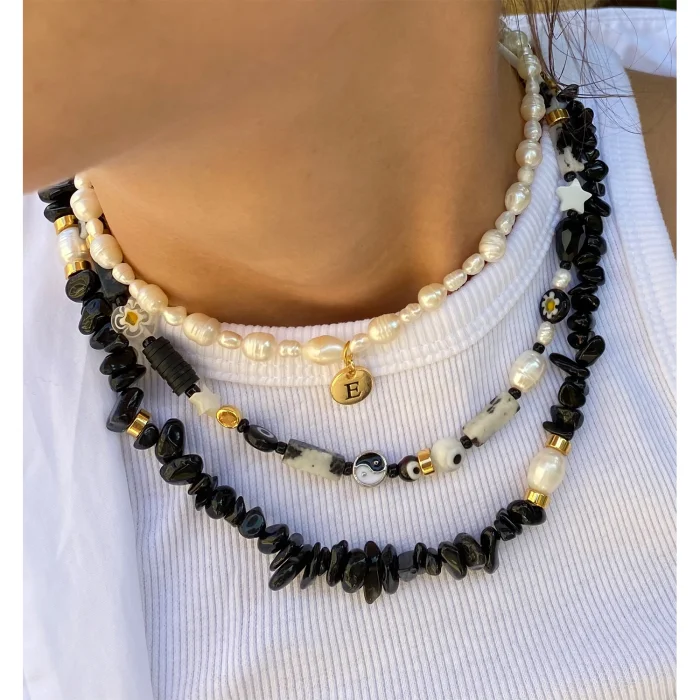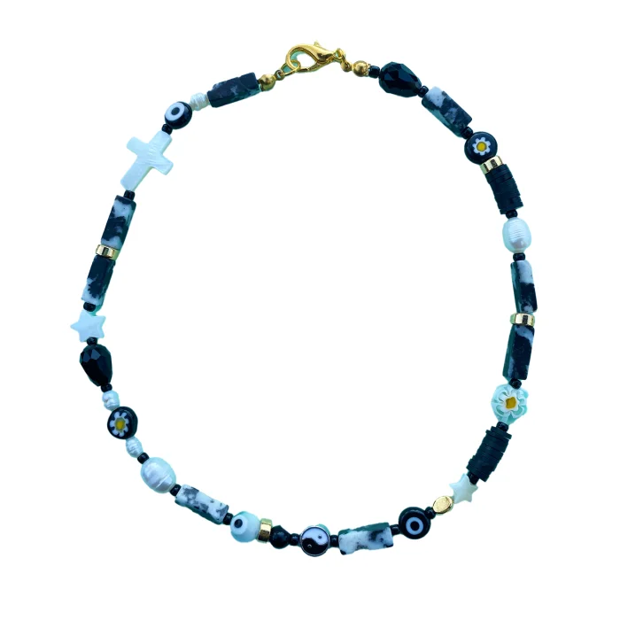 Made from pearl, howlite stones, glass beads and nacre. Length: 40cm