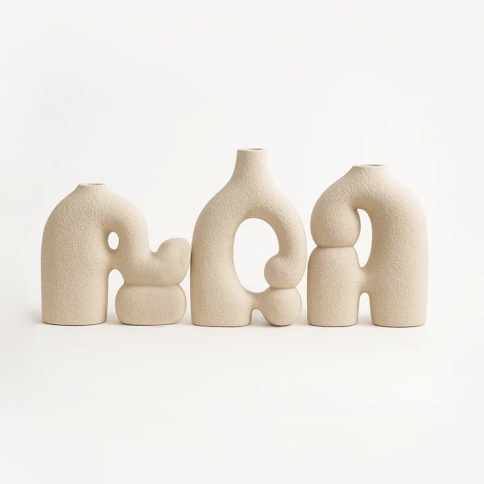 Each mini-sized ceramic vase in the set draws attention with its unique, abstract and organic forms. Its natural beige/off-white color and textured surface enhance the aesthetic value of the product, while blending perfectly into modern and minimalist decorations. Thanks to the fact that they are handmade, it is ensured that each vase has a unique character. This deco vase set is an impressive work of art on its own, adding a touch of elegance to any corner of your home or office.
