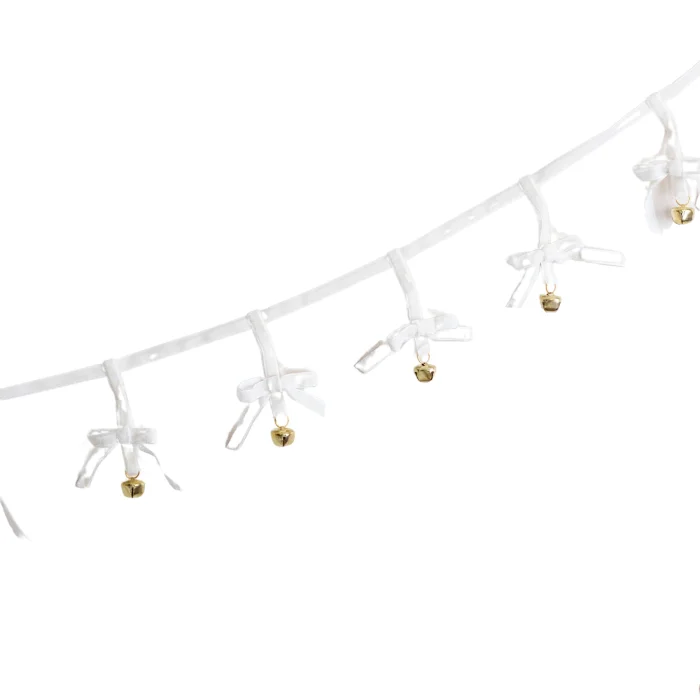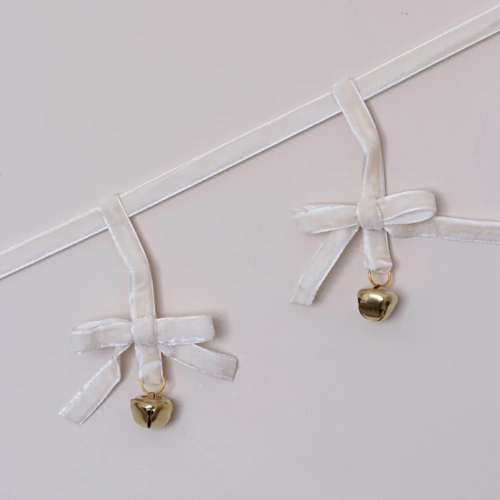 Decorate your tree, staircase or fireplace in a true traditional Christmas style with the "Velvet Bell Ribbon Chain" from the Beige & Stone Christmas collection. Each with ten white bows and gold bells. Quantity: 1 Dimensions: Total: H 10 x L 140cm Gold bells: Diameter 2cm Made of velvet ribbon and iron bells. Each chain consists of 10 springs and bells.