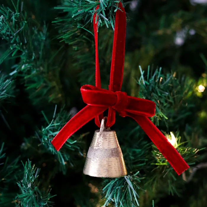 Decorate your tree in a real traditional Christmas style with the "Velvet Ribbon Bell" from the Beige & Stone Christmas collection. Each set consists of 3 different sizes. ; Dimensions:; Small: Gold bells: H: 4 cm ; Medium: Gold bells: H: 5 cm ; Large: Gold bells: Y: 7 cm ; The length of all bells is 12 cm, including the ribbon. It is made of velvet ribbon and brass bells. ;
