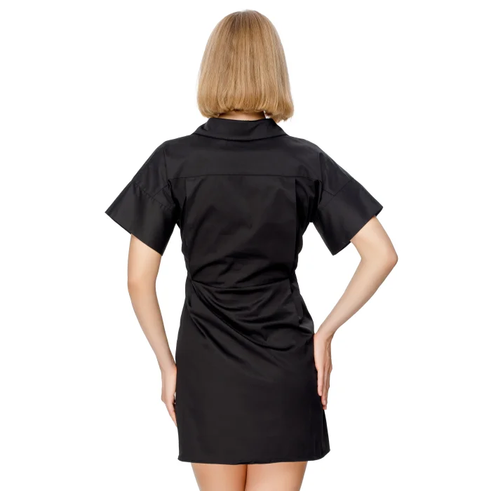 It is made of 97% Cotton fabric. The shirt is shaped and has a button that is hidden down to the bottom.