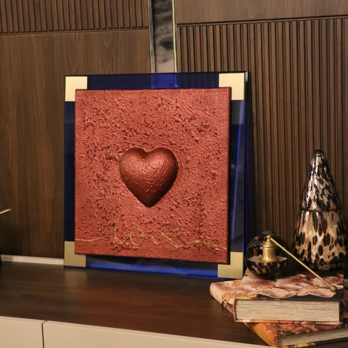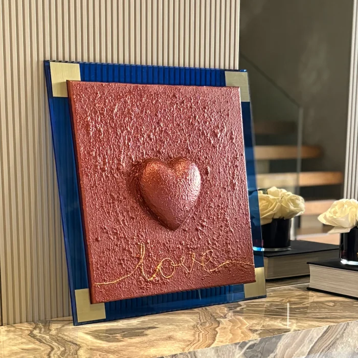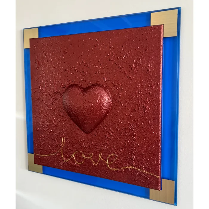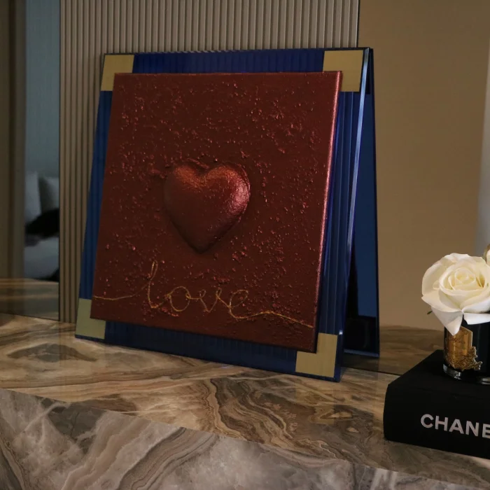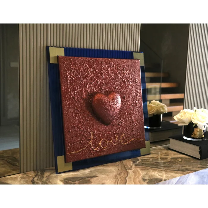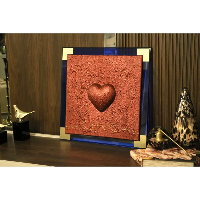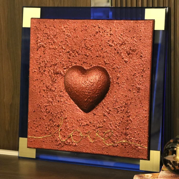 Its total size, including the frame, is 48 cm × 48 cm. The heart is 3D and embossed.