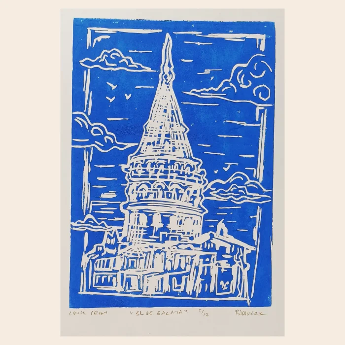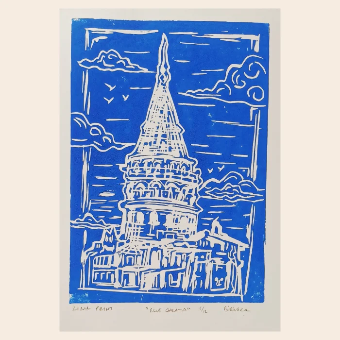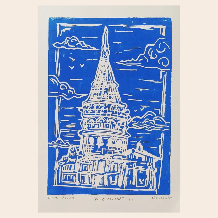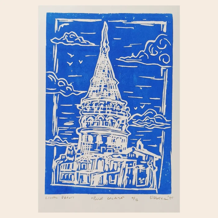 The original artwork from the Istanbul Icons Series by Birim Erol, signed in 2025, is a linocut print on A4 craft paper measuring 21 x 30 cm. Only 12 editions have been printed using the linocut technique.