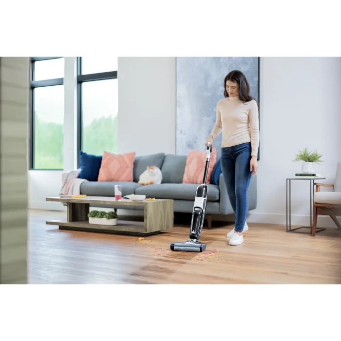 The Bissell CrossWave HF3 Cordless Pro vacuums, wipes and dries your hard floors in one go. Enjoy quiet, cordless cleaning and saving time. This lightweight and easy-to-carry machine combines sweeping and wiping in one go, saving time in cleaning. With automatic water handling, convenient self-propelled steering, and simple automatic cleaning modes, the CrossWave HF3 Cordless Pro offers a pleasant clean. Clean in Low Mode for quick light cleaning, or switch to High Mode for stubborn stains that stick to your hard floors. Different from the traditional mop and bucket, it keeps clean and dirty water separate with double chamber technology. That's why, with the CrossWave HF3 Cordless Pro sweeping and wiping machine, you always clean your hard floors with fresh clean water. After each use, you can remove dirt and debris from the roller brush with the push of a button. After cleaning, it minimizes the hassle of cleaning your machine and helps maintain its performance.