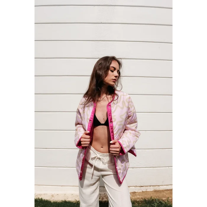 - Fabric pattern design with digital (quantity printing) application belongs to our brand. On both sides of the jacket, the closure method is snap fastening.