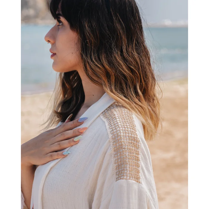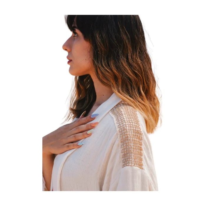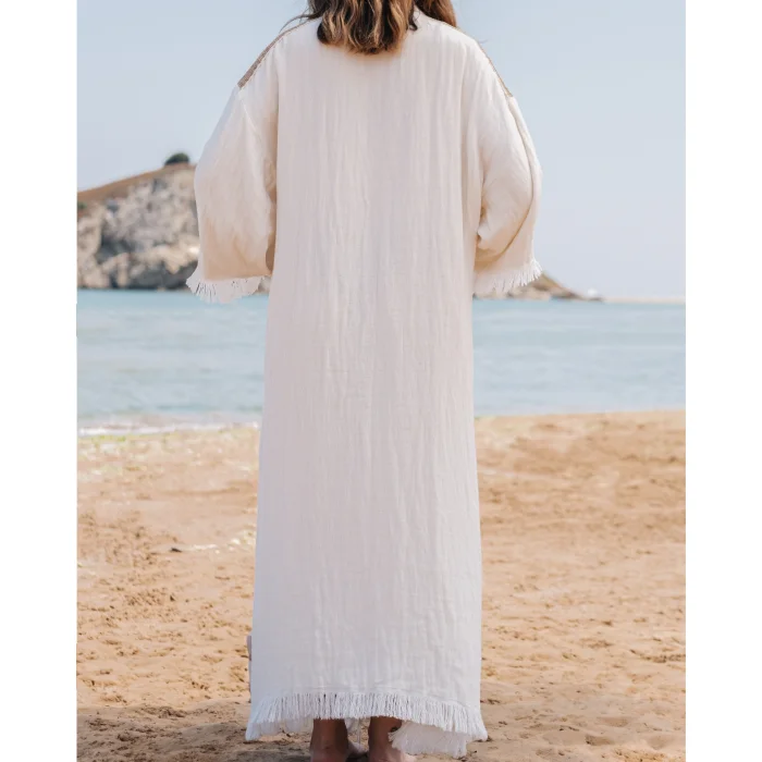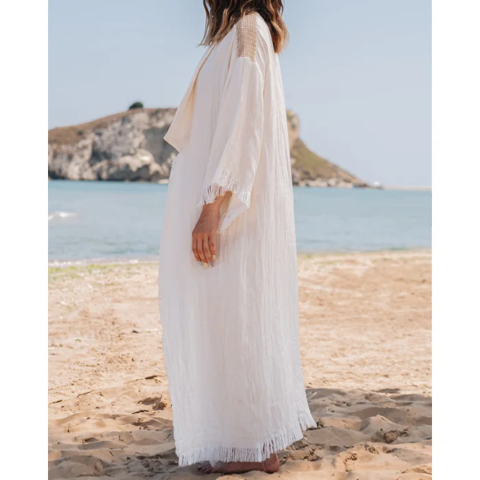 Lovingly handcrafted, this piece combines bohemian glamour with elegance. Crafted with muslin fabric in tranquil natural tones, this kimono allows you to easily combine it with a variety of outfits and helps you achieve a stylish boho look. Unleash your inner goddess with the minimalist design of this kimono! "Experience the heart of Turkish craft with Bohémisse's eco-friendly fashion. Our garments, which are handmade from completely natural materials unique to Şile, Turkey, promise softness and breathability in every yarn." Product Details Title: Simplicity Serenade Bohemian Kimono Categories: Tasseled Kimono, Kimono Cover, Kimono Topcoat, Long Kimono, Maxi Kimono, Tasseled Kimono, Printed Kimono, Lace Kimono, Decorated Kimono, Kimono Cardigan Fabric: 100% Organic Turkish Cotton; Peshtemal Style: Bohemian, Boho, Boho Chic, Minimalist, Casual Colors: Off-White, Natural Availability: Loose Fit Occasion: Holiday Wear, Casual, Festival, Spring, Summer, Daily Wear Design Details: Lace Strip on Shoulder, Lower Edges and Sleeve Edges, Tassels on Lower Edges and Sleeve Ends, Shawl Neckline, Kimono Neckline, Ankle Length, Kimono Sleeve, Wide Wide Sleeves, Open Front