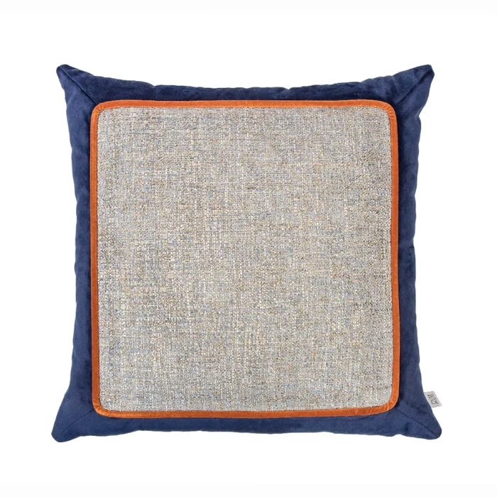 Square navy blue framed pillow, with orange trimming. Back of the pillow is plain velvet fabric.