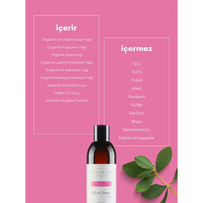 INGREDIENTS: Aqua, Organic Aloe Vera Juice, Decyl Glucoside, Natural Rose Flower Water, Hydrolyzed Wheat Protein, Dicaprylyl Ether (and) Decyl Glucoside (and) Glyceryl Oleate, Vegetable Glycerin, Coco-Glucoside (and) Glyceryl Oleate, Vegetable Xanthan Gum, Sorbitan Sesquicaprylate, Organic Rosehip Oil, Organic Coconut Oil, Benzoic Acid, Sorbic Acid, Dehydroacetic Acid, Benzyl Alcohol, Organic Olive Oil, Organic Lavandula Angustifolia Essential Oil, Organic Chamomile Essential Oil, Organic Geranium Essential Oil, DESCRIPTION: It is an organic, 100% pure product specially developed for sensitive, dry, itchy, allergic and problematic skin. With its natural, herbal and pure botanical ingredients and intensive moisturizing feature, it instantly soothes the skin with its rapid effect, helps prevent itching, rashes and red spots. Restores skin irritation and prevents skin dryness. It strengthens the skin barrier, improves skin quality, helps fur to be healthier, softer and shiny, and helps to reduce hair loss and dandruff. It provides a natural SPA experience with its aromatherapeutic ingredients. With its gentle and sensitive cleaning, it provides long-term rejuvenation and removes unwanted odors. It is suitable for sensitive skin. It is easily rinsed and provides easy combing. It is suitable for dogs' skin pH structure. It is ecological, vegan, animal and environment friendly. It does not contain harmful and toxic chemicals. It does not contain perfume, dye, colorant, SLS, SLES, phthalate, paraben, alcohol and sulfate. DIRECTIONS: Wet dog’s coat with water, pour enough Botanivo shampoo and lather it into the dog’s coat and skin by massaging. For best results, leave it on the body for 1-2 minutes and then rinse thoroughly.