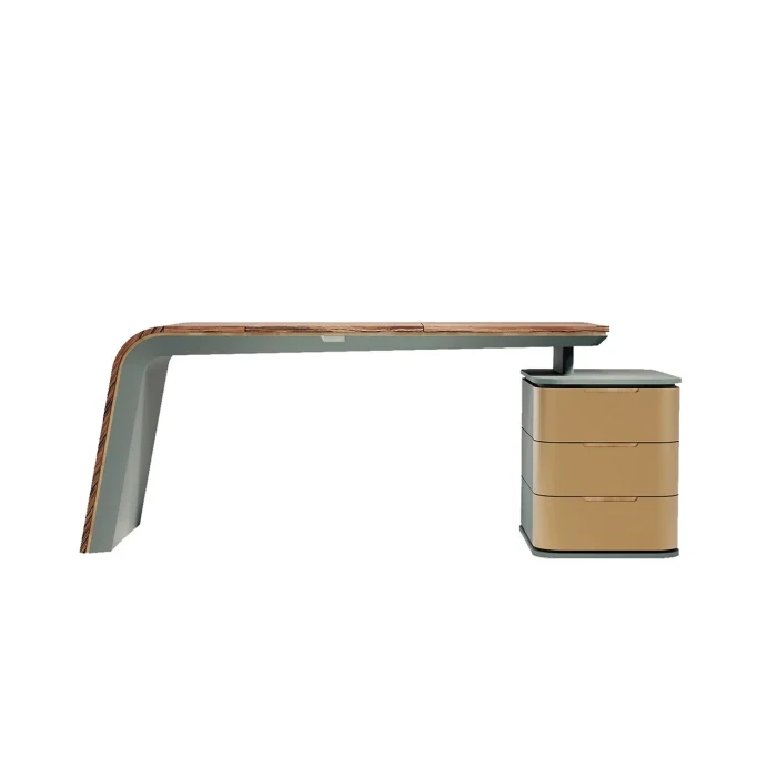 MATERIALS Table: MDF, ALPI Japanese Cedar Coating, Iron Construction Caisson: MDF, ALPI Japanese Cedar Coating Handle: Recessed Channel Handle Polish: Silk Matt Varnish, Matt Lacquer Polish DIMENSIONS Table Width: 179 cm Table Depth: 70 cm Table Height: 76 cm Caisson Width: 50 cm Caisson Depth: 72 cm Caisson Height: 60 cm