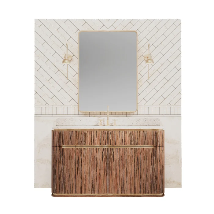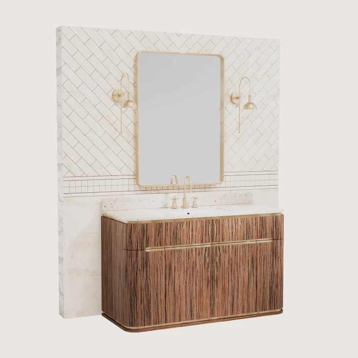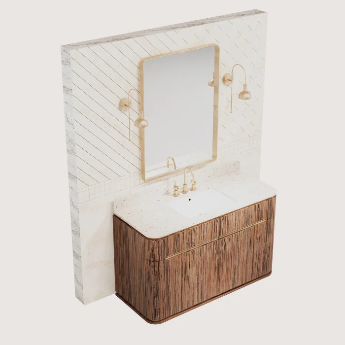 MATERIALS Body: MDF, ALPI Japanese Cedar Veneer Handle: Recessed Channel Handle Countertop: Belenco Sahara Beige Sink: Ceramic Undercounter Polish: Silk Matt Mirror: 4mm Plain Battery: Not Included Siphon: Not Included DIMENSIONS Width: 140 cm Depth: 60 cm Height: 85 cm Mirror Width: 80 cm Mirror Height: 120 cm
