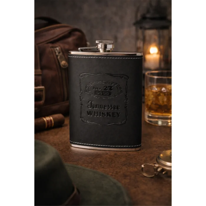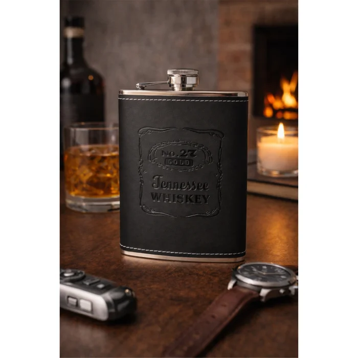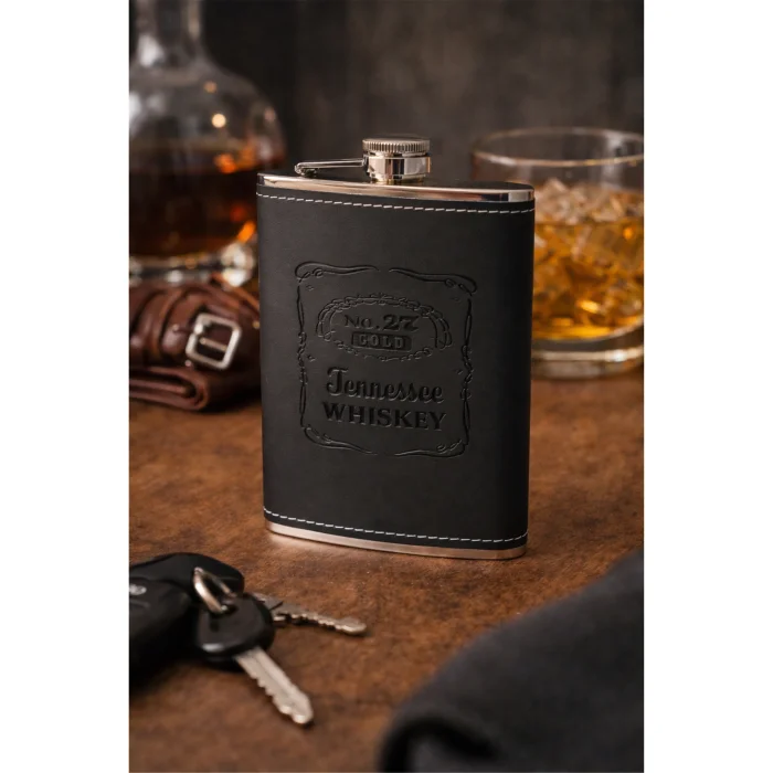 It is a metal flask with a stylish and timeless design with a leather-covered exterior. It can be used as a bar accessory, also suitable for gift. Thanks to its compact form, it is easy to carry.