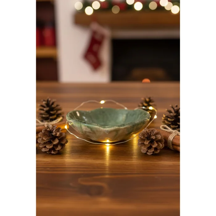 Standing out with its leaf form inspired by nature, this ceramic bowl adds an elegant touch to the tables with its deep shades of green. Thanks to its natural form shaped by hand, each one is unique in its own way. It is an ideal piece for nuts, appetizers or decorative use.